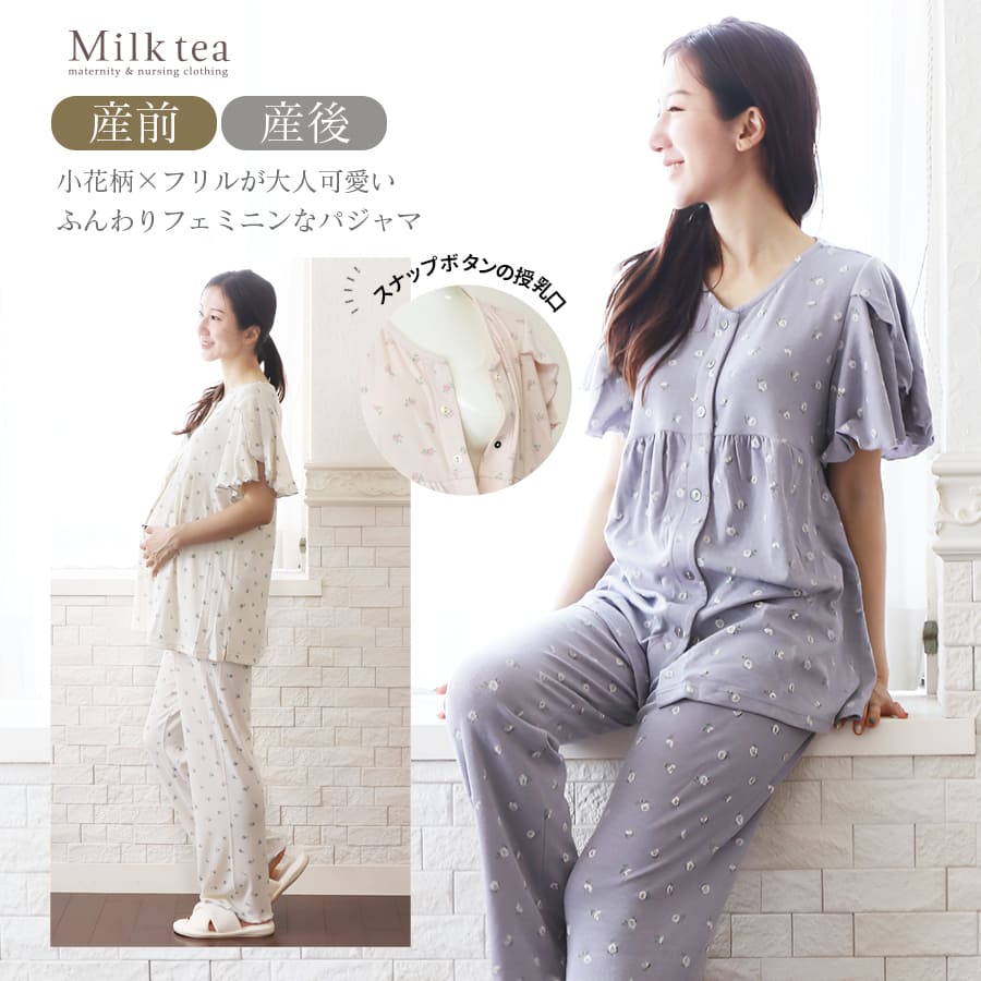 商品カテゴリ:授乳服 マタニティ 妊娠 出産 産前産後 マタニティウエア マタニティファッション 入院準備 出産準備 産院 パジャマ ママパジャマ 寝巻き 上下セット フリル袖 メロー袖 半袖 妊婦 妊婦服 マタニティー 春 夏 秋 リラックス ルームウエア ママ ミルクティー ミルクティ Milk tea 585107