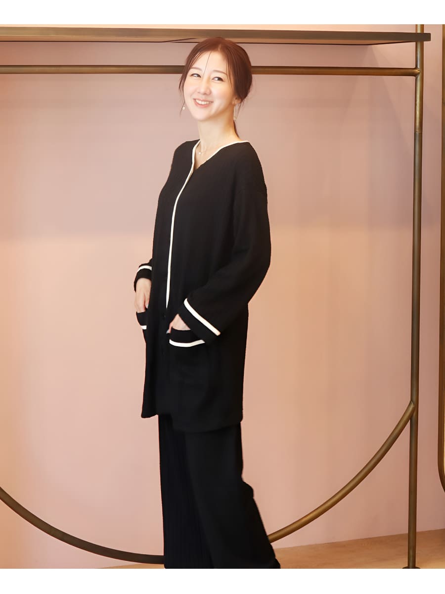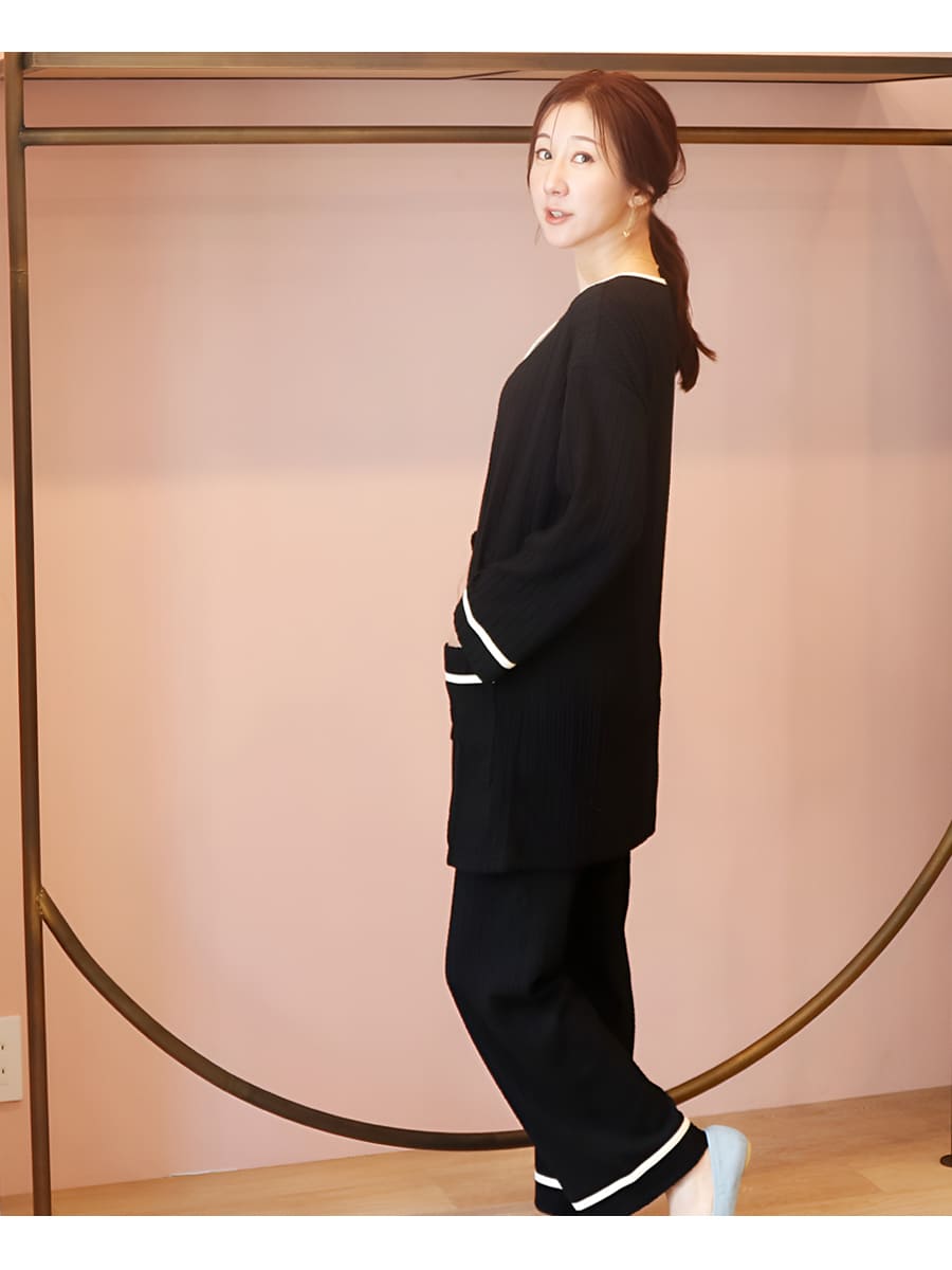 ・ロング丈のトップス、ウエストゴムのパンツのセットです。