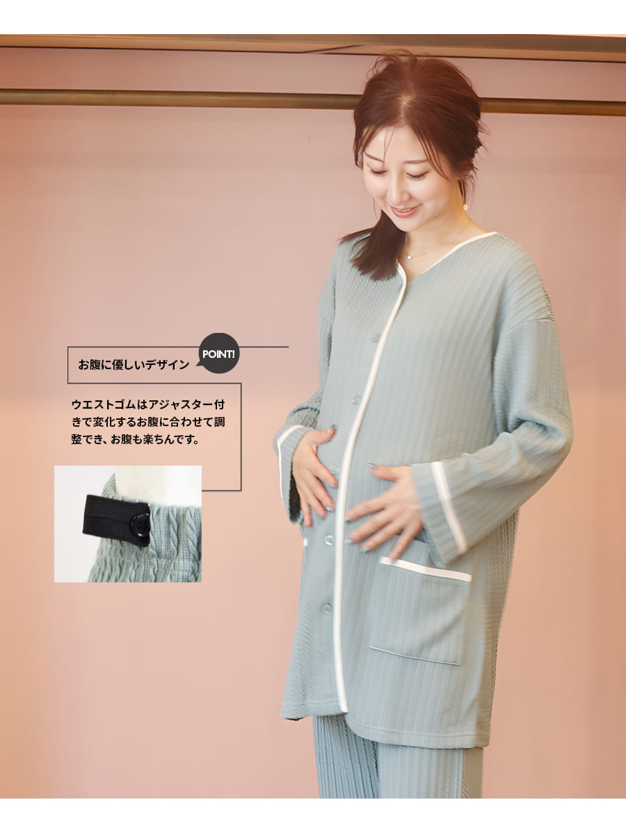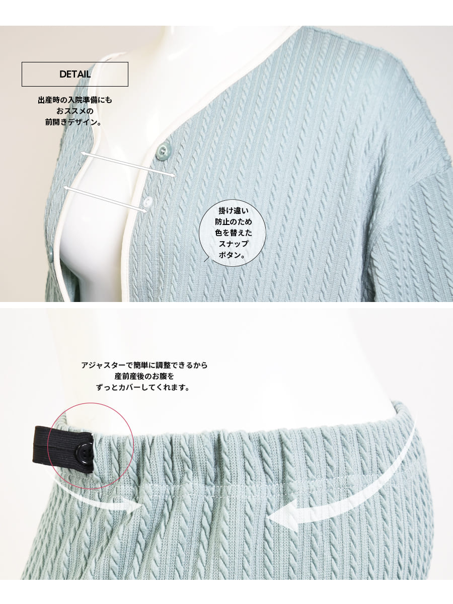・パンツはゴムアジャスター付きでお腹部分が調整できるので、妊娠中から産後まで、変化する体型に合わせて優しい着心地で楽ちんです。