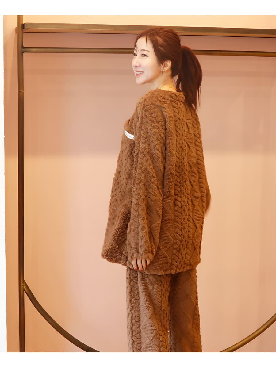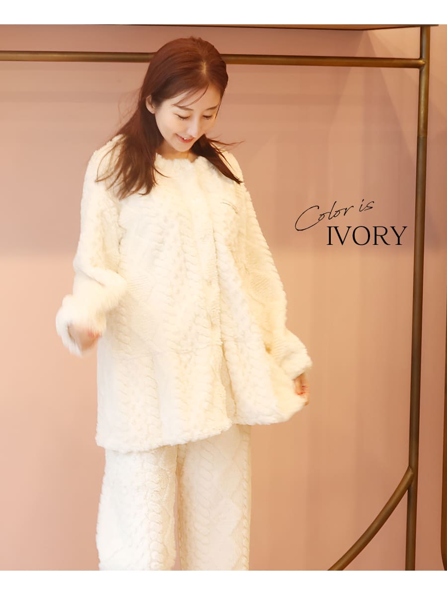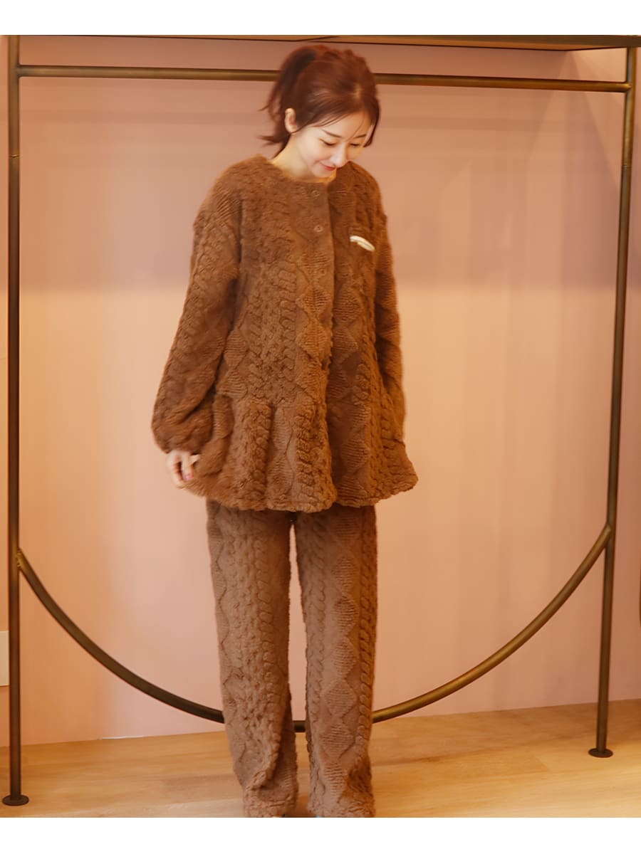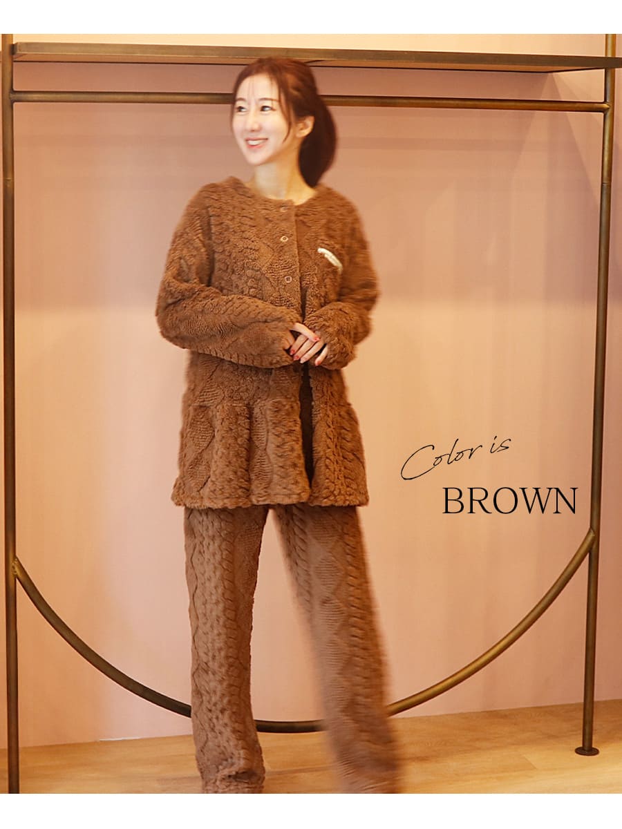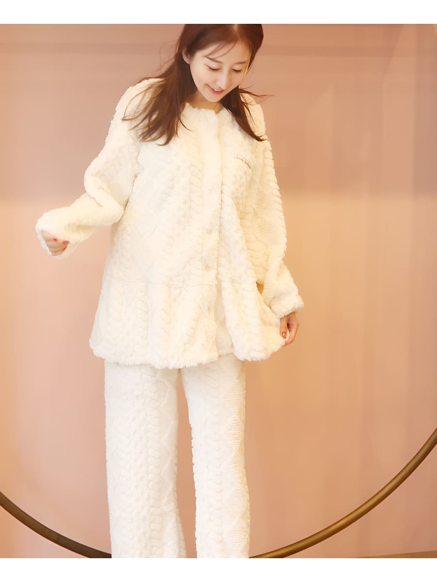ニュアンスのあるケーブル編みが魅力のフリースパジャマ上下セットです。