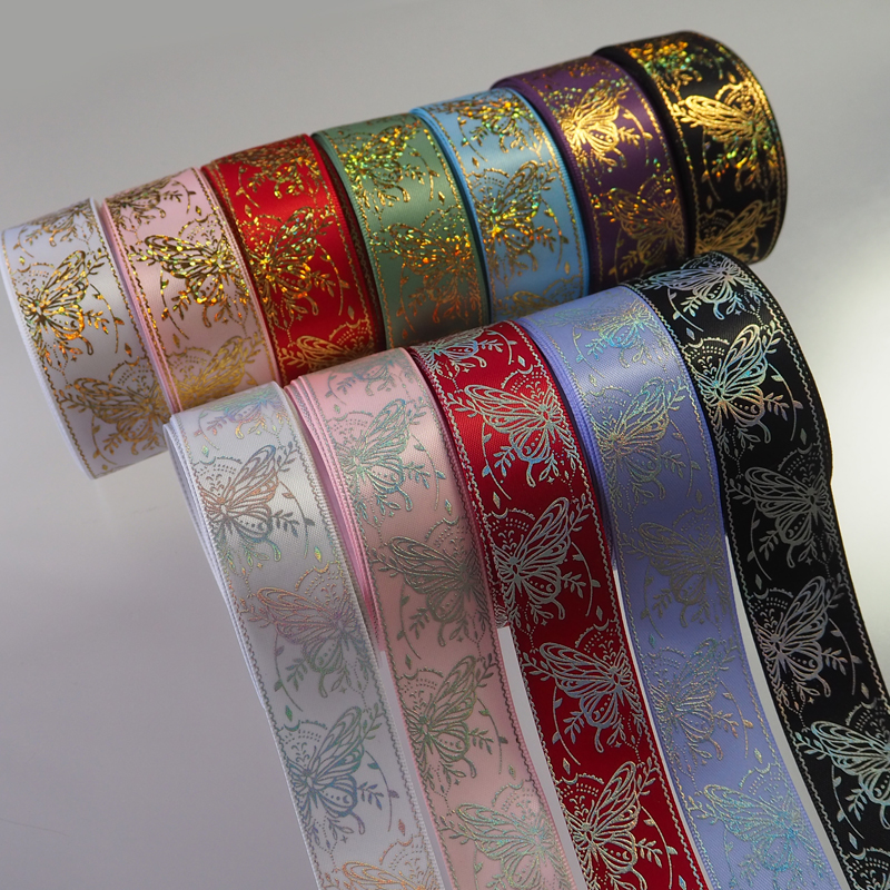 全12色 蝶柄 バタフライ サテンリボン シルバ オーロラ ゴールド ホログラム 箔押し