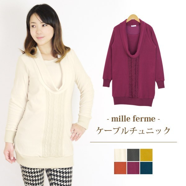 ミルフェルム おしゃれ 授乳服 裏綿 フリース オフネックケーブル編みチュニック母乳育児 安い 可愛い 授乳ケープ