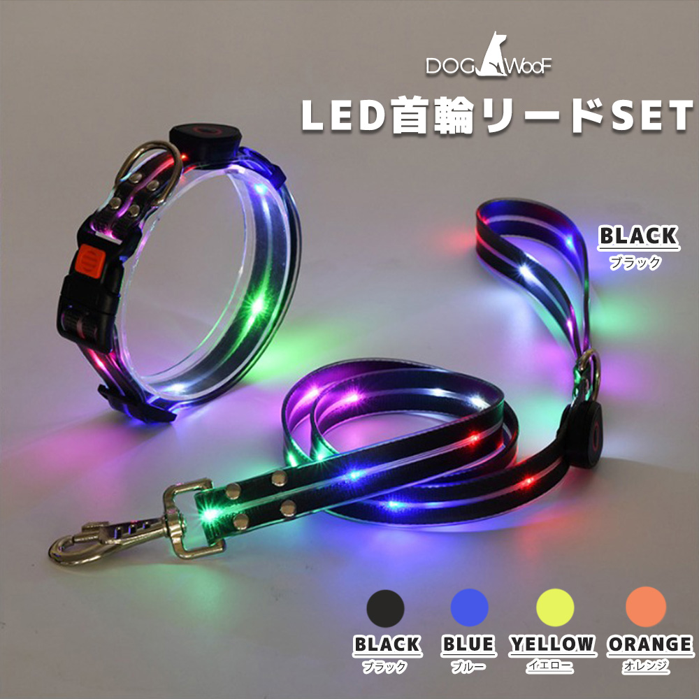 LED首輪リードセット 光る首輪 光るリード リード長さ120cm 首回り35〜55cm調節可能 夜の散歩 USB充電式 (ブラック / オレンジ / イエロー / ブルー )