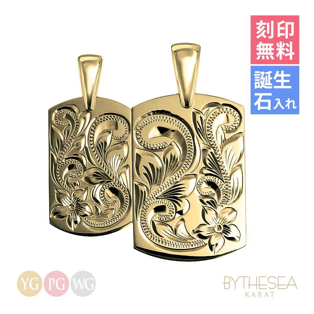 ハワイアンジュエリー ペアネックレス 刻印無料 誕生石入れ可 ドックタグ 合わせてハート模様 2個セット K14ゴールド 金 40代 50代 30代 20代