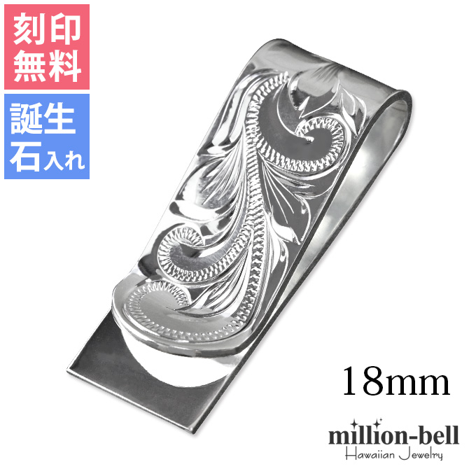 マネークリップ 刻印無料 名入れ 誕生石入れ可 シルバー925 ハワイアン彫り スクロール 幅18mm お札カードはさみ 40代 50代 30代 20代