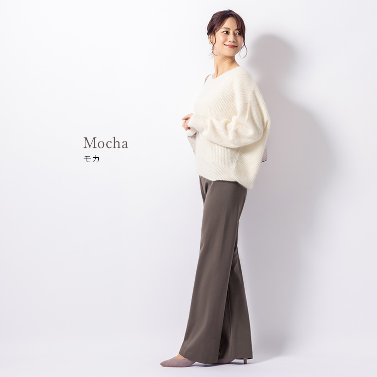 | ★最適サイズ/M いつもミミグラントのワンピースは、Sサイズを選んでいます。 ウエストもヒップも丁度良いです。 素肌に履くとウエストだけ若干緩いですが、インナーなど何かインすると落ちる感じがなくなります。 私は脚が全体的に太く、太もも51cm、膝上39cm、ふくらはぎ34cmで膝上の肉が多いため、普段はパンツをキレイな形で履けないのですが、このパンツは膝周りの脚の太さを感じさせずすごくキレイに履けました。 履くと膝周りが少し細く見え裾に向かって緩やかに開いているので、脚が長く見えます。 横姿も、ポケットやファスナーによる浮きが無いためお腹周りが太って見えません。 伸縮性があり肌触りも良く、履き心地は部屋着くらいラクチンなのに生地の質感やまつり縫い仕上げのお陰でブラウス・シャツ・ニットなどをタックアウトして着るとキレイめな仕上がりで、見た目は部屋着感ゼロです。 着丈は床すれすれくらいでウエストの緩みで少し下がると床に着いてしまいますが、洗って丈が少し縮んだら丁度いいかなという感じです。 | |
