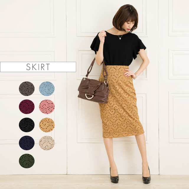 | ★最適サイズ/Mトール 普段当店のワンピースはMまたはMトールサイズを着用しています。 (ケリーXラインの無地等、伸縮性が低めの厚手のワンピースはLサイズ着用) MとMトールサイズでぴったりのサイズでした。全体的に程よくフィットし、体のラインに沿います。 しっかり伸びるレースなので、着脱もスムーズで、動きづらさもありませんでした。 Sサイズだときつくなり、着脱時にヒップで引っかかってしまいます。Lサイズは全体的に大きくてゆるいです。 丈はMサイズで膝が隠れるくらいの丈で、ミモレ丈としては少し短い印象です。 Mトールサイズは膝下3〜5cm位になり、しっかり長さのある理想的な丈になりました。 裾が折り返して処理してあるので甘すぎず、大人なレーススカートです。 | |