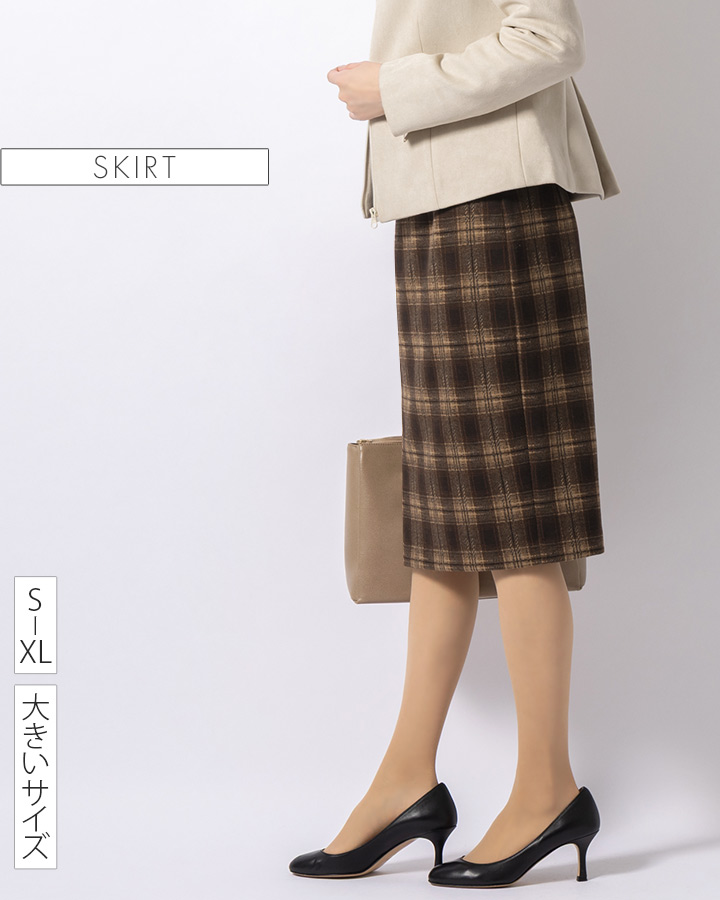 | ★最適サイズ/S いつもミミグラントのワンピースはSサイズ、タイトスカートはSかMサイズを着用しています。 このスカートはSサイズが丁度良いです。 Mだと若干緩く感じ少しモッサリした印象になります。 丈は膝頭がしっかり隠れる着丈で上品ですが、タイツやロングブーツ合わせても重たい印象にならない丈感です。 ウエストのゴムが幅広でしっかりしているうえにゴムにもダーツを入れウエストのカーブに沿うように作られているので、穿いたときにウエスト周りの収まりが良くきちんと見え綺麗です。 ゴムのスカートには見えません(^^) 程よい厚みのウール調素材は肌触りも良く暖かで、ストレッチでストレスフリーな着心地なので、秋冬に大活躍しそうです。 | |