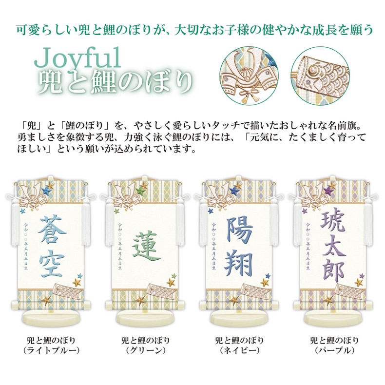 「兜」と「鯉のぼり」を、やさしく愛らしいタッチで描いたおしゃれな名前旗。勇ましさを象徴する兜、力強く泳ぐ鯉のぼりには、「元気に、たくましく育ってほしい。」という願いが込められています。