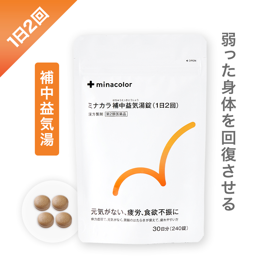 | 成分分量 | 1日量(8錠)中 補中益気湯エキス(1/2量)...... 2370mg ニンジン......2.0g ビャクジュツ......2.0g オウギ......2.0g トウキ......1.5g タイソウ......1.0g サイコ......1.0g チンピ......1.0g カンゾウ......0.75g ショウマ......0.5g ショウキョウ......0.25g より抽出。 |