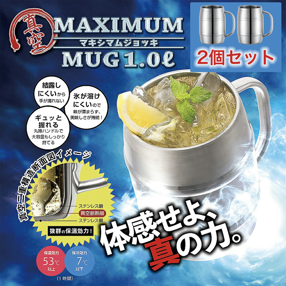 お得な2個セット 真空二重マキシマムジョッキ 1.0L 樽型 ステンレス製 大容量 ビック ビールジョッキ キャンプ BBQ 真空二重構造 1リットル 1L 1000ml