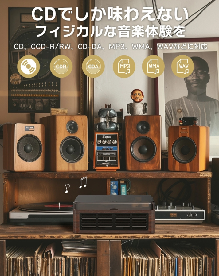 CD、CD-R、CD-RW、CD-ROM、MP3、WMA、WAVなど、多くの音源を再生できます。 市販のCDだけでなく自作CDも楽しむことが可能です。