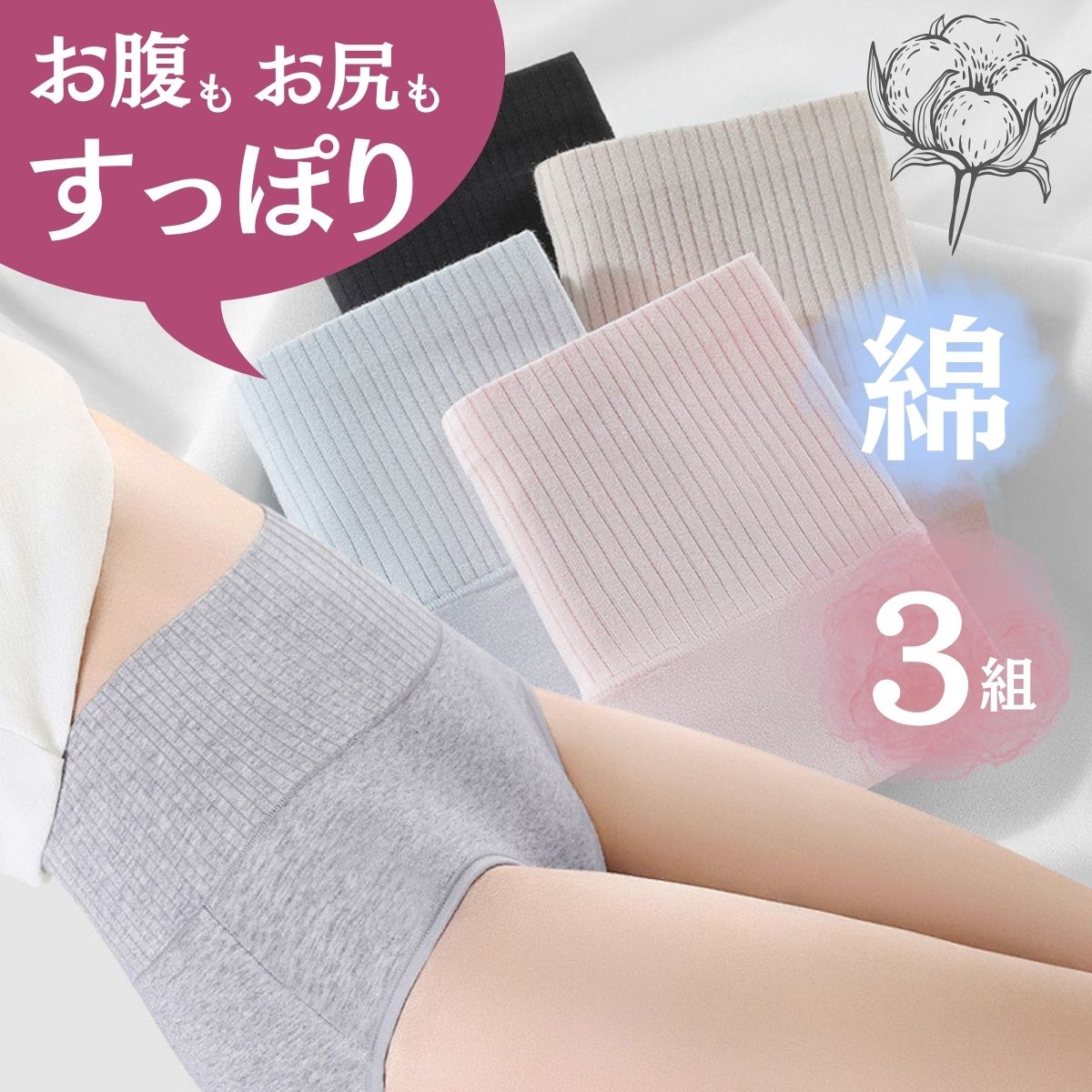 【在庫処分】3枚セット 綿 コットン ハイウエスト ショーツ レディース 桃尻 温活 下着 深め 深履き 爆買