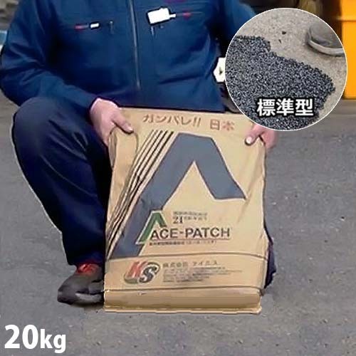 KS アスファルト補修材 『エース・パッチ 標準型』 20kg (補修の深さ15mm以上用)道路面のくぼみや穴など特殊な機械を使わずに補修が可能です。雨や雪の日でも作業が可能です。施工が容易で、鎮圧補修後すぐに交通開放させることが出来ます。樹脂入りバインダーと選別された骨材を混合した特殊・高分子型温合材。