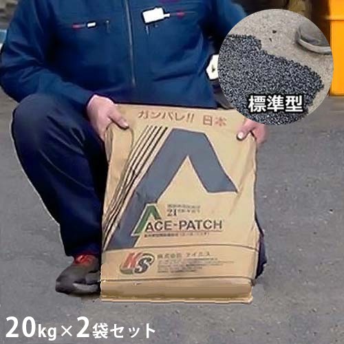 KS アスファルト補修材 『エース・パッチ 標準型』 20kg 2袋セット (補修の深さ15mm以上用)道路面のくぼみや穴など特殊な機械を使わずに補修が可能です。雨や雪の日でも作業が可能です。施工が容易で、鎮圧補修後すぐに交通開放させることが出来ます。樹脂入りバインダーと選別された骨材を混合した特殊・高分子型温合材。