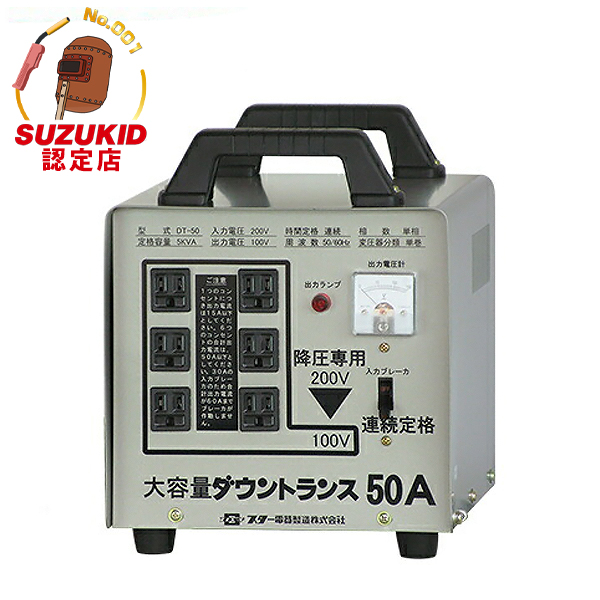 DT-50 型は余裕の連続大容量変圧器。200Vを100VMax50Aに変換します。変圧器構造は高効率連続型を採用していますので、自重21Kgとやや重いのですが過負荷に強く頑丈な設計となっております、トランス入力には接地3P20A電源プラグコードが付いています。