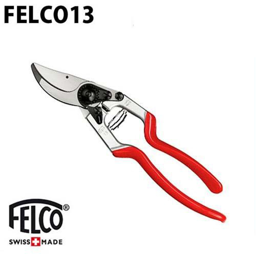 フェルコ 剪定鋏 FELCO13 (切断能力30mm/片手・両手兼用/アングルカット型)FELCO13はアングルカット型のため、刃に力を伝えやすく高い切断能力のある高機能型のプロ用剪定鋏です。片手・両手のどちらでもハンドルを握れるロングハンドルタイプのため、最大切断能力が30mmと一般のハサミよりも大きく、太枝も切断できるのが特徴です。切刃にはスイス製の高品質刃を使用しているため、鋭い切れ味があり精密で美しい剪定が可能です。また衝撃吸収材により切断時の手への負担が少なく、プロの剪定職人からも高い評価を得ています。