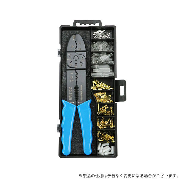クリンピングプライヤー・ギボシ端子セット(10セット)・平端子セット(10セット)・丸型端子8mm(5セット)・クワ型端子6mm(5セット)・裸端子先開型(R1.25-3・R2-4各3個)・裸端子丸型(Y1.25-3・Y2-4各3個)
