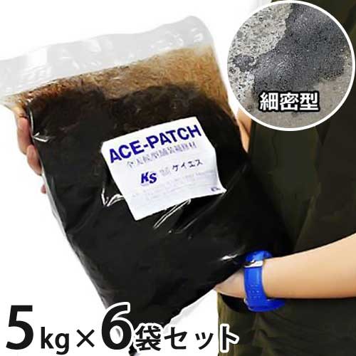 KS アスファルト補修材 『エース・パッチ 細密型』 5kg 6袋セット (補修の深さ20mm以下用)道路面のくぼみや穴など特殊な機械を使わずに補修が可能です。雨や雪の日でも作業が可能です。施工が容易で、鎮圧補修後すぐに交通開放させることが出来ます。樹脂入りバインダーと選別された骨材を混合した特殊・高分子型温合材。
