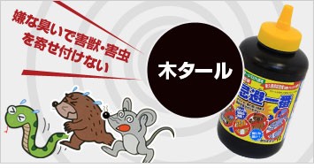 木タールで害獣を追い払う!動物が本能的に嫌う煙の臭いを液化したタールで、害獣・害虫を追い払います。雨にも強く、効果は約2ヶ月持続します。※写真は1Lです。