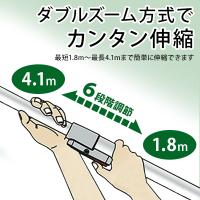 6段伸縮式Wズーム機能2つのズームレバーを握って内側のパイプを操作するだけで、カンタンに伸縮することができます。最短1.8m〜最長4.1mまで6段階に調節が可能です。