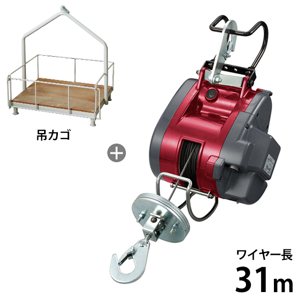 京セラ 電動ウインチ AWI62D (吊上荷重60kg/ワイヤー31m) +荷物吊りカゴ付セット建築現場 工場内作業に最適な100V小型軽量吊り下げ型ウインチと鉄フレームで頑丈な荷物吊りカゴをセットにしました。