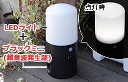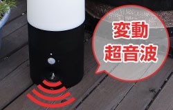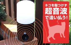 外が暗くなると人をセンサーが感知しLEDライトが自動で点灯ガーデンセンサーライトと、猫が嫌がる音を発し猫を傷つけず追い払うアニマルバリアブラックミニがセットになっています。超音波は毎回異なった周波数を出す為、猫の「慣れ」を防ぎます。乾電池式で、電源がない場所でも設置ができます。防雨設計なので、雨の場合でも使用できます。