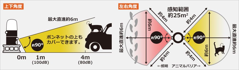 センサー感知範囲25平方メートル感知範囲25平方メートルの高感度センサーを搭載。ボンネットの上にいる猫にも反応します。照明用のセンサーも同じ範囲で感知します。