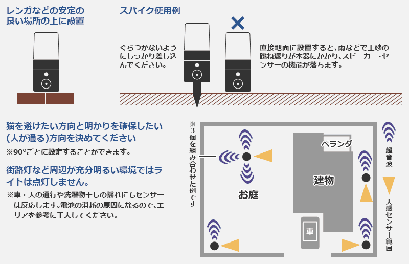 ●直接地面に設置すると、雨などで土砂の跳ね返りが本器にかかり、スピーカー・センサーの性能が落ちます。同梱のスパイクを使用するか、レンガ、ブロックなどの上に設置してください。