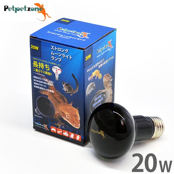 ストロング ムーンライトランプ 20W (夜用 保温球)やわらかな紫色の光で狭い範囲に熱を照射する、夜行性の生体用の保温球です。夜間点灯しても眩しくないため、あらゆる生体の夜用保温球としても適しています。生体の体温が上がる事で、食べ物の消化や代謝を高める効果が得られます。また、周囲の空気も暖め、生体が呼吸時に暖かい空気を体内に取り込む事ができます。