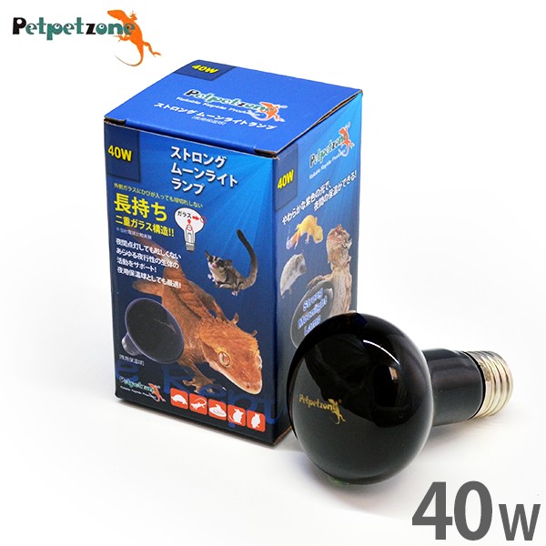 ストロング ムーンライトランプ 40W (夜用 保温球)やわらかな紫色の光で狭い範囲に熱を照射する、夜行性の生体用の保温球です。夜間点灯しても眩しくないため、あらゆる生体の夜用保温球としても適しています。生体の体温が上がる事で、食べ物の消化や代謝を高める効果が得られます。また、周囲の空気も暖め、生体が呼吸時に暖かい空気を体内に取り込む事ができます。