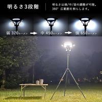明るさは強(650lm)、中(450lm)、弱(320lm)の調整が可能。360°広範囲を照らします。