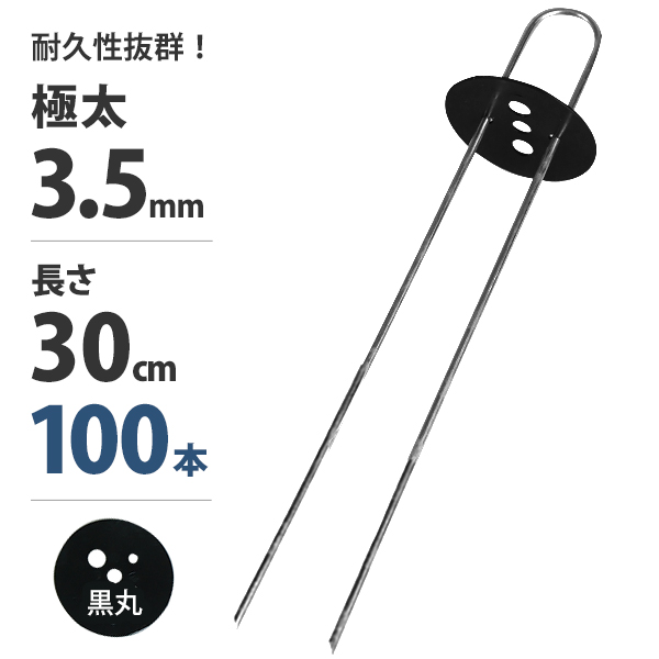 極太3.5mm Uピン杭+黒丸付き 30cm 100本セット (ブラック/防草シート用) [U字型 抑え杭 押さえピン コ型ピン ヘアピン杭 除草シート]