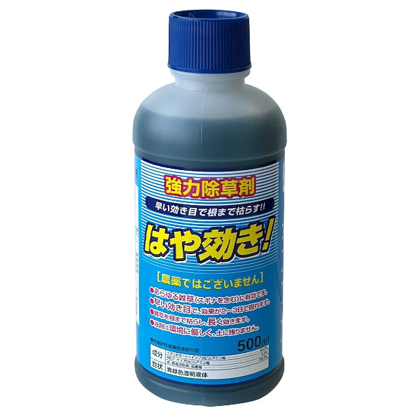 | はや効き 500ml / 5L / 20L | 散布後 2?3日後 | [グリホサート]イソプロピルアミン塩…34.0% MCP イソプロピルアミン塩…6.5% 水、界面活性剤、色素等…59.5% |