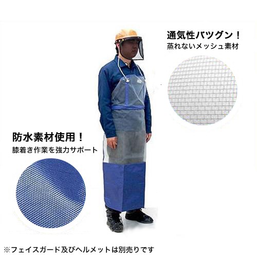草刈機(おもにナイロンカッター)での作業による小石の飛散などから身体を守ります。ウエスト部分を装着するだけのワンタッチ着脱。裾部分が従来タイプよりも長くなっており、膝から下の部分に防水素材を使用しているために、農作業などでの膝着き作業も可能です。水洗いも可能です。