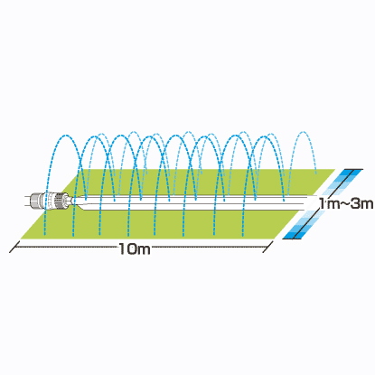 芝生や庭木の散水に最適なチューブタイプです。散水範囲は幅1-3m、長さ10m。