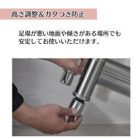 【便利な収納台とアジャスター】流し台の下には作業に必要な道具や洗った物を置くことができる、広くて便利な収納台がついています。