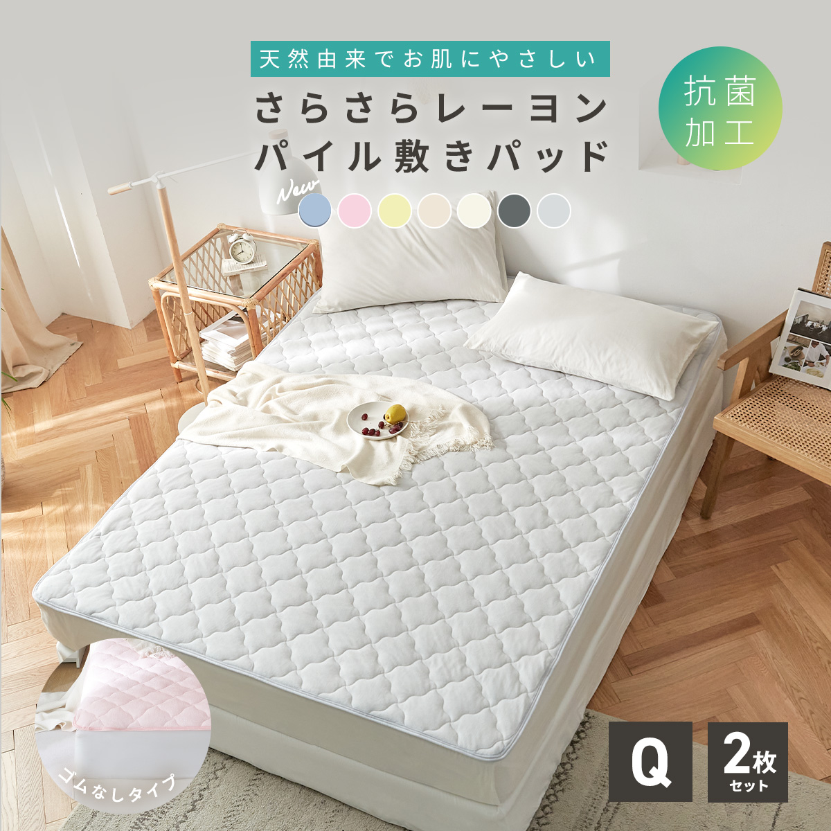 ゴムなし敷きパッドは滑り止め付きで、置くだけだから装着ラクラク。