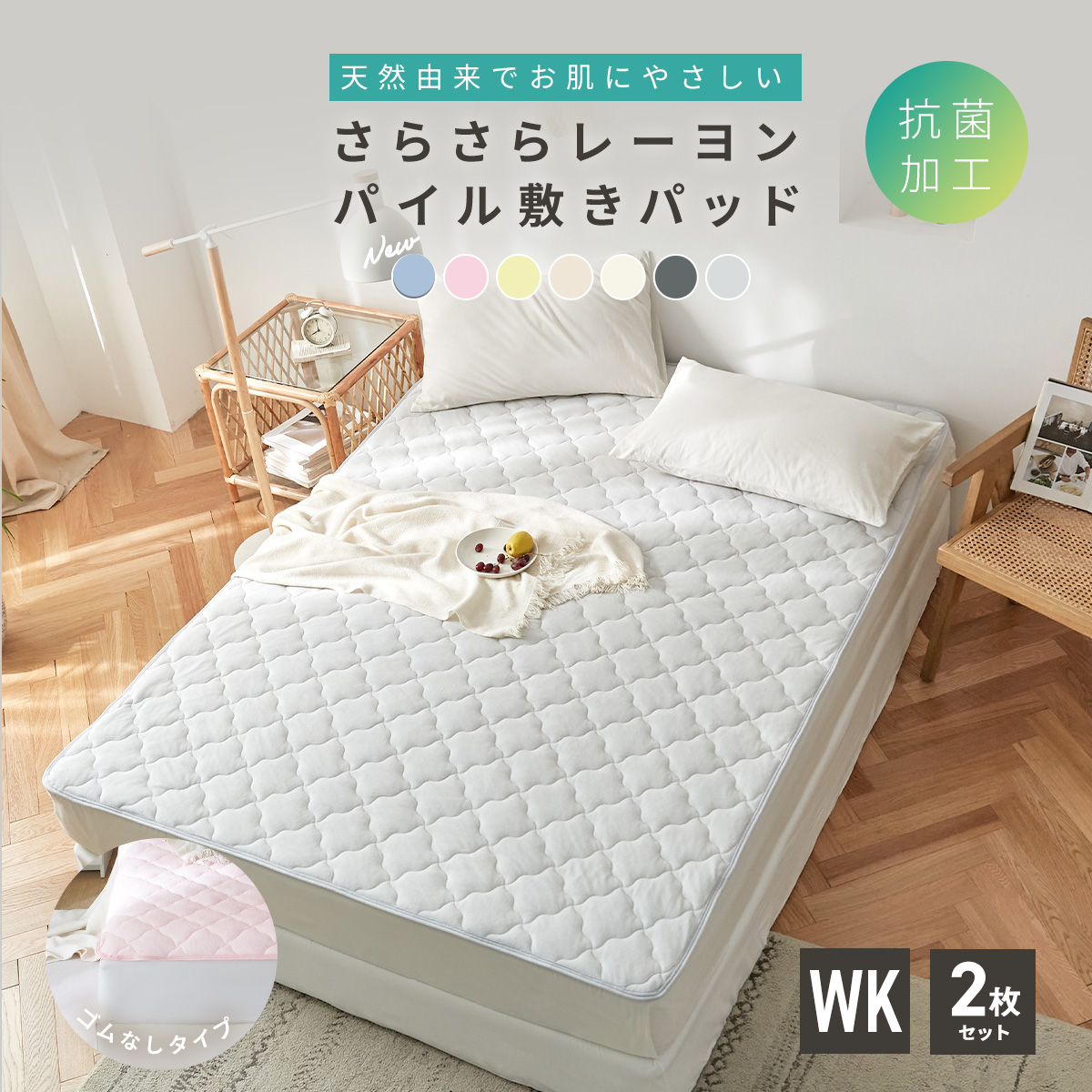 ゴムなし敷きパッドは滑り止め付きで、置くだけだから装着ラクラク。