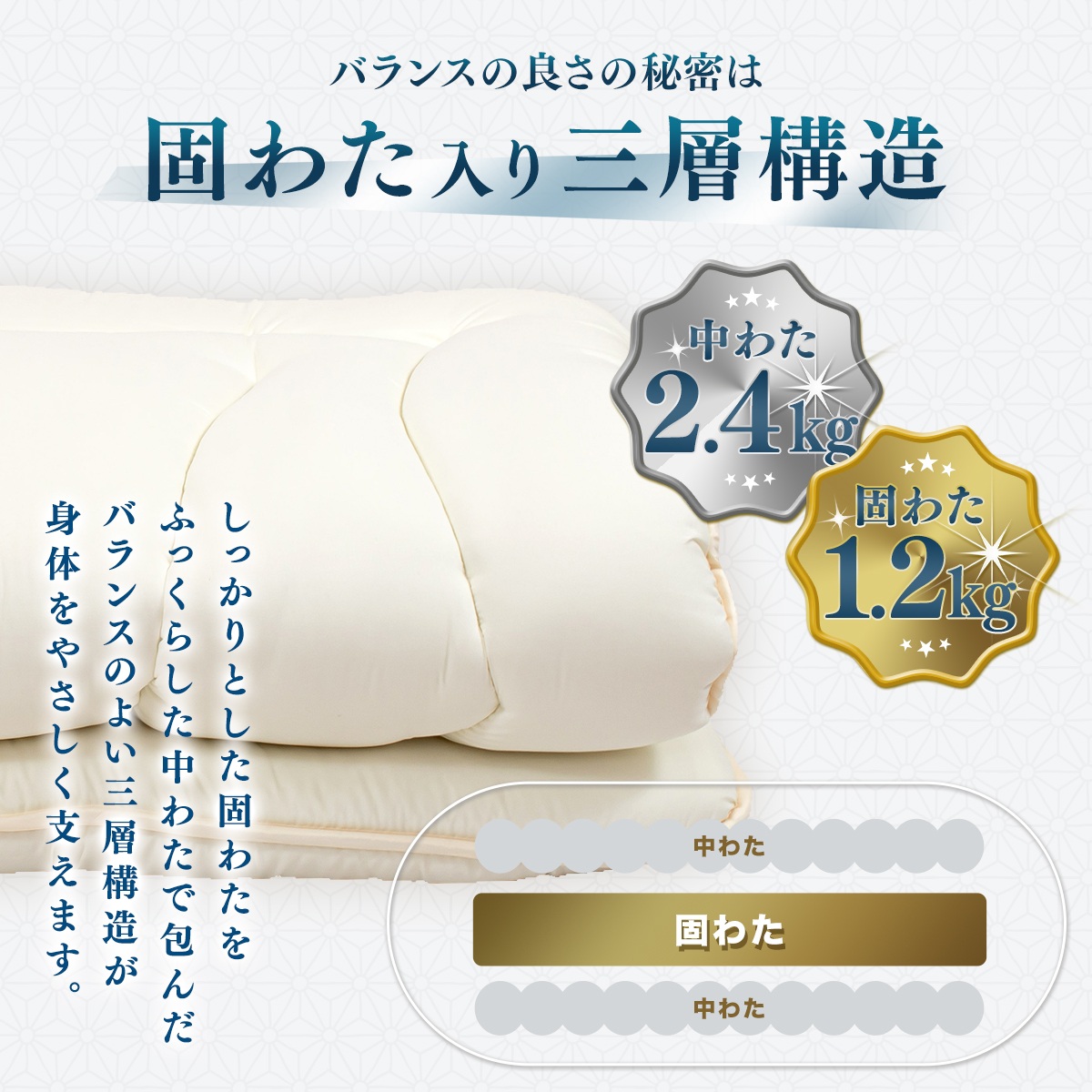 型崩れしにくい、丈夫なふとんに仕上がっています。