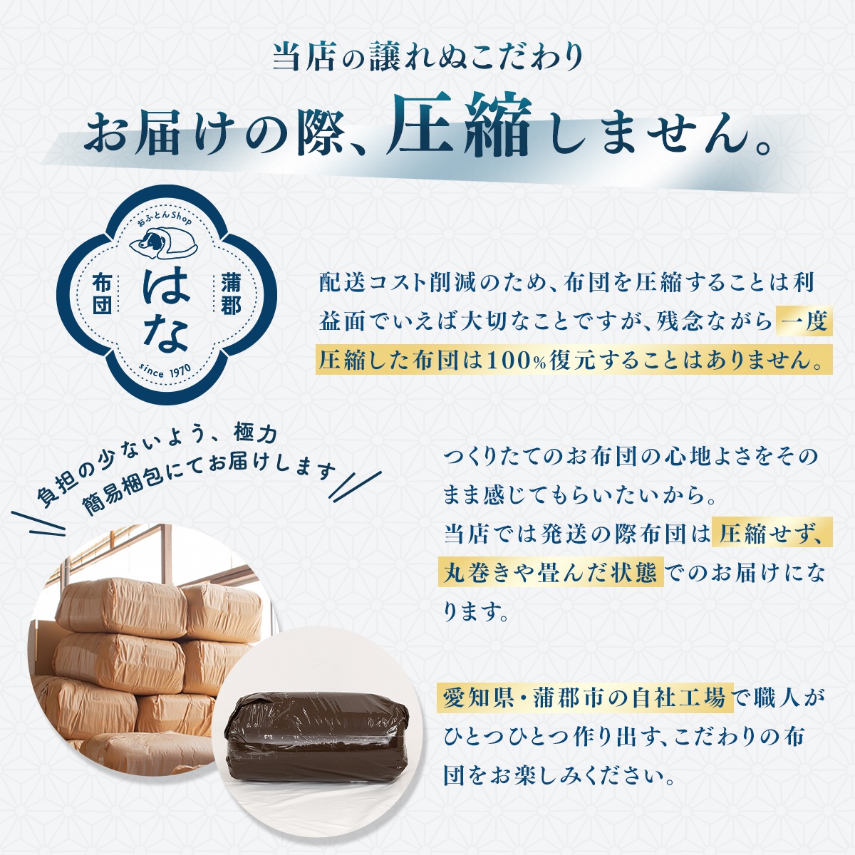当店のふとんは”圧縮せず”丸巻きや畳んだ状態でお届けします。