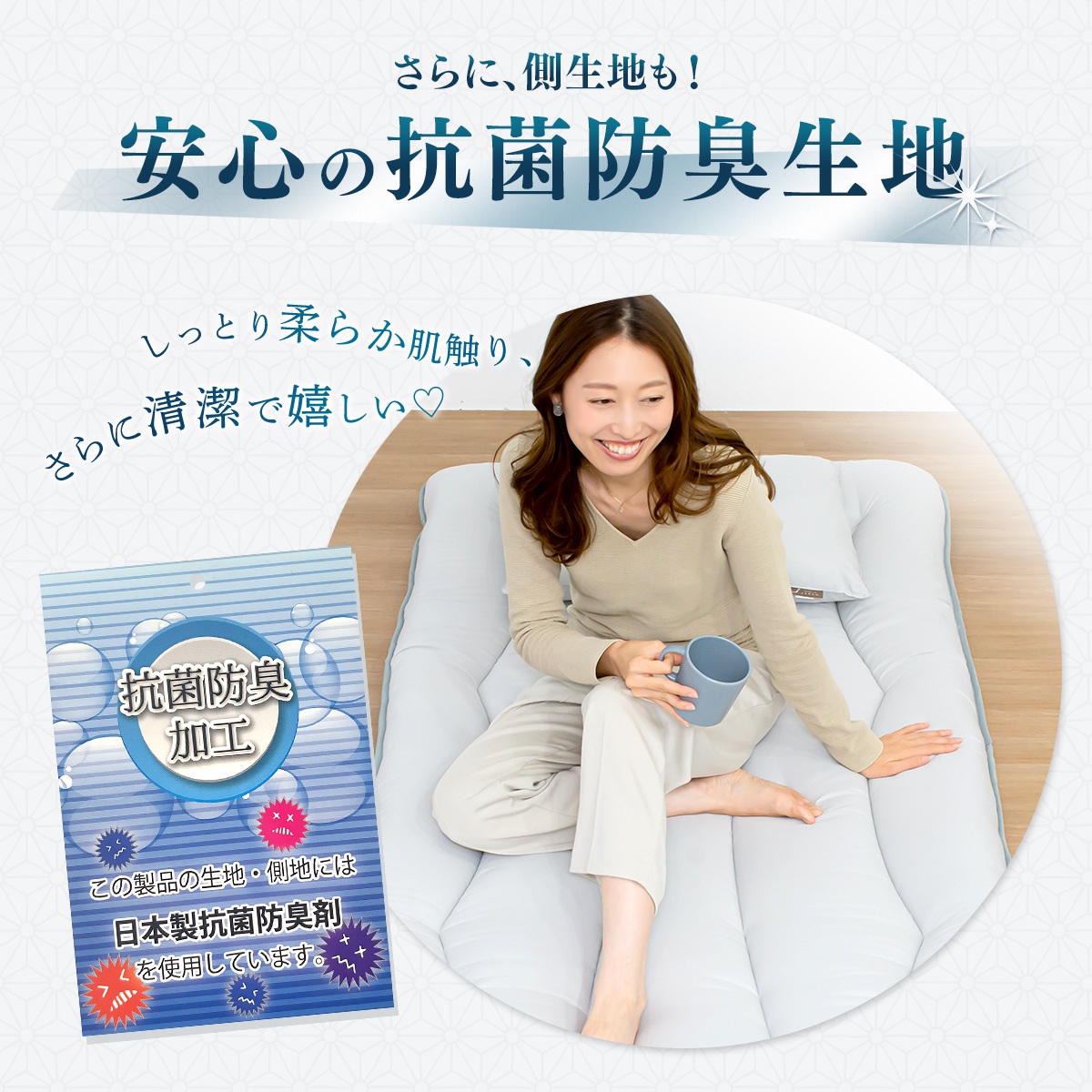 また、表側の生地にも抗菌防臭加工がされているので 日々清潔にお使いいただけます。