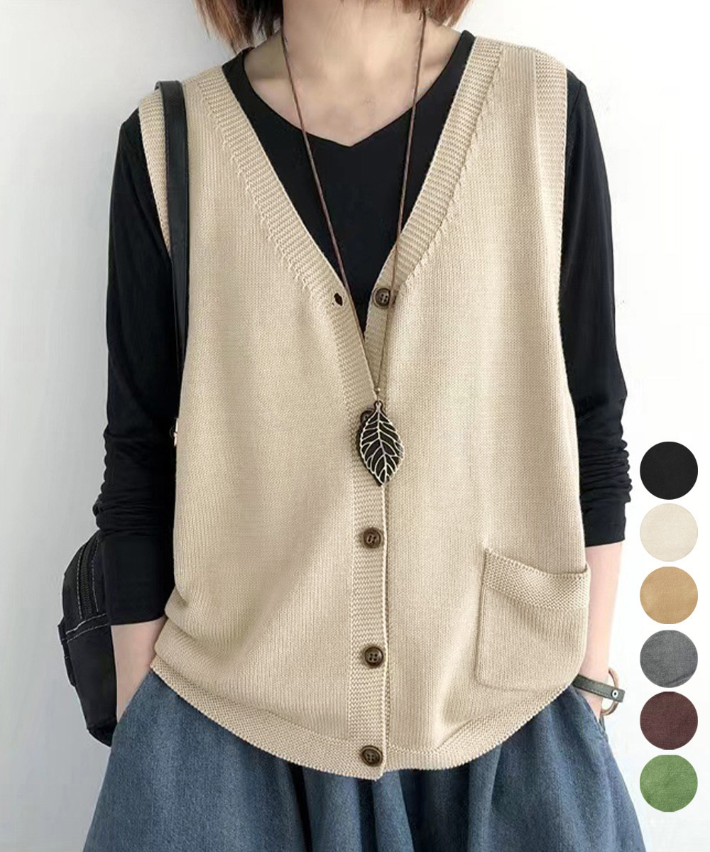 ポケット付きニットジレ Vネック ノースリーブニットトップス カジュアル レトロ ニットタンク 体型カバー春秋服 韓国風