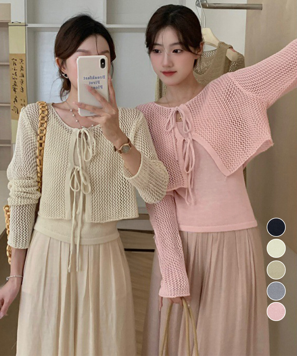 Uネックニットキャミ 透かし編みカーディガン 薄手ニットアンサンブル リボンカーディガン 長袖ニット着回し春夏服 韓国風