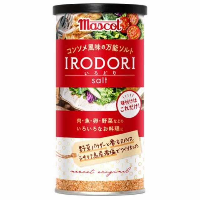 【常温】 トマト、オニオン、にんじんなどの野菜のパウダーとスパイス、シチリア島産岩塩をブレンドしたコンソメ風味の万能ソルト。 野菜のうま味とスパイスをいかしたコンソメ風味が、肉・魚・卵・野菜など素材を選ばず、いろいろなお料理のおいしさを“いろどり”ます。 1975年発売「サラダエレガンス」を継承し、ネーミング・パッケージデザインを新たに、お料理のおいしさを“いろどる” IRODORI になりました。 発売以来のおいしさはそのまま。サラダはもちろん、もっといろいろなメニューに使っていただけるようさまざまなレシピもお届けしていきます。