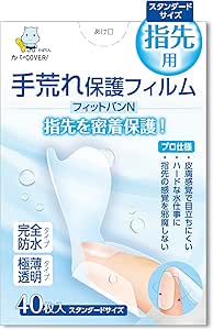 しっかり巻き付きハードな仕事にも安心プロ仕様! 仕事で毎日使える大容量。 特徴2:水に強く剥がれにくいため、手荒れをしっかり保護できる 美容師や理容師など、水仕事の多い職場で働くプロのために開発された手荒れ保護用の絆創膏です。 水の浸入を防ぐシリコーン粘着剤を使用しており、耐水性に優れ、シャンプーや洗剤を使う水仕事でも傷口に染みないプロ仕様です。 特徴3:目立たない(理美容師さんをはじめ、プロの手荒れに大変ご好評いただいている「プロ仕様 手荒れ保護フィルム フィットバンN」と同じ0.03mmの極薄フィルム)指先にフィットする形状