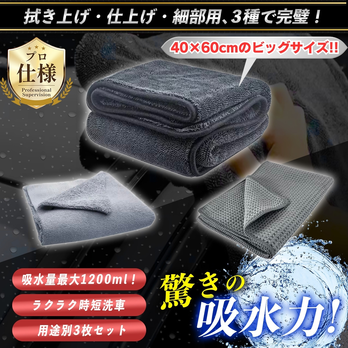 高吸水&速乾性に優れたプロ仕様の3枚セットで、ボディ・ガラス・内装まで完璧に仕上げます。