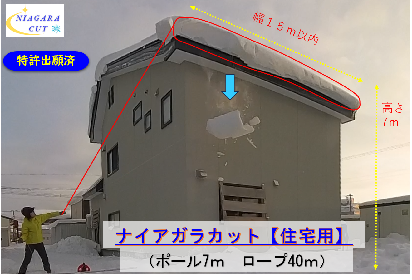 伸縮ポールで雪庇にロープを掛け、フックで締めることにより、雪を切断します
