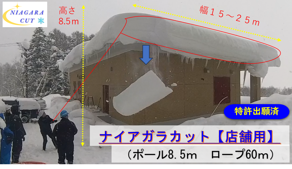 伸縮ポールで雪庇にロープを掛け、フックで締めることにより、雪を切断します