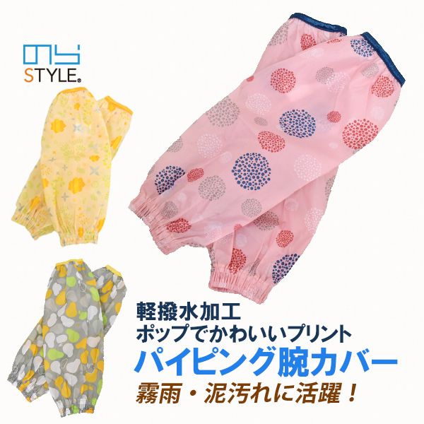 可愛いプリント柄でコーディネートが楽しくなる腕カバー。風を通しにくく、軽くて、柔らかい軽撥水加工のポリエステル素材で、水仕事や、霧雨・泥汚れにも活躍。